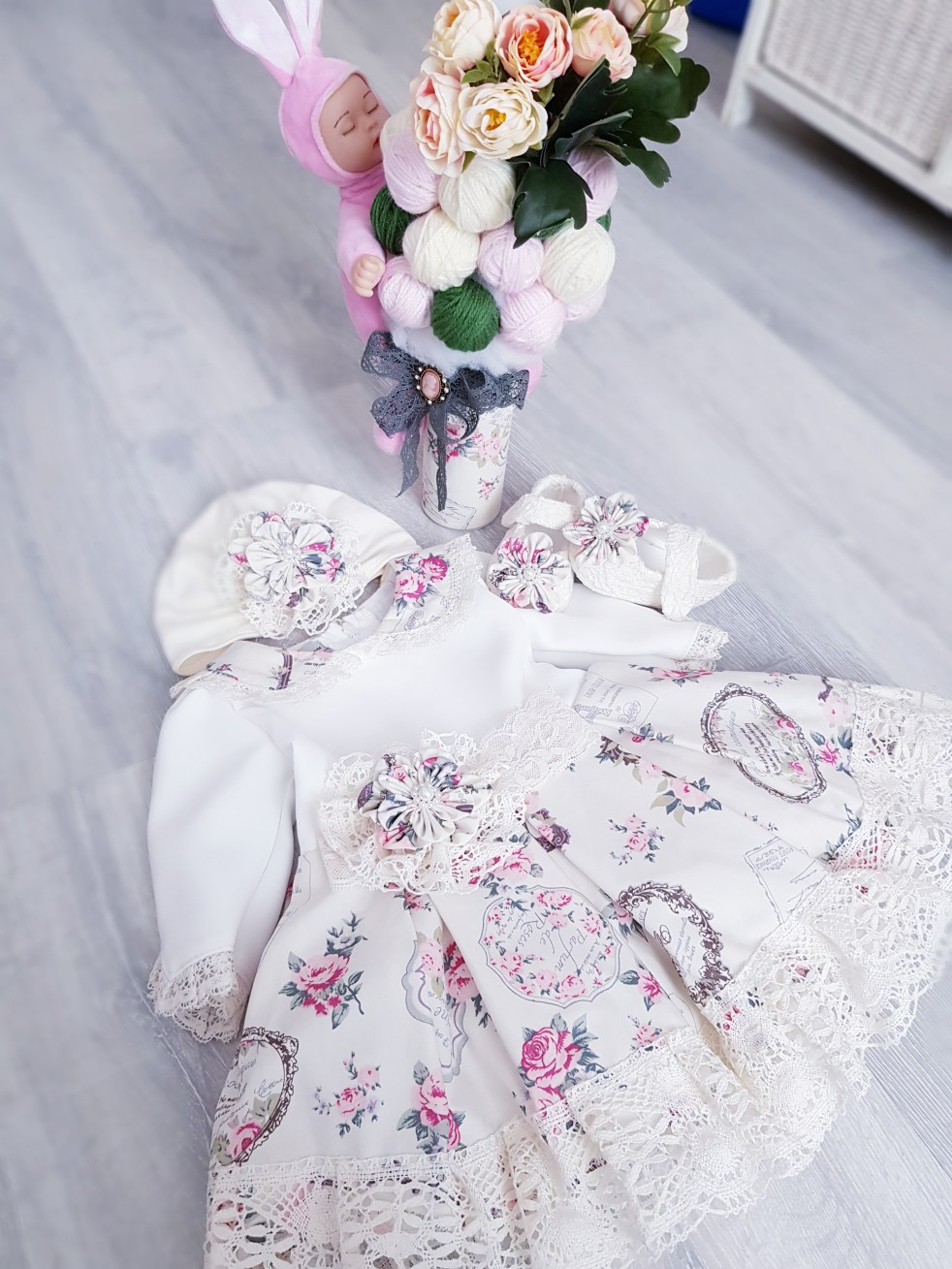 Bună ziua, asi dorii sa comand rochița aceasta, turbanul,bentita și papuceii. Fetita are un an. Ma ajutați va rog. Mulțumesc.